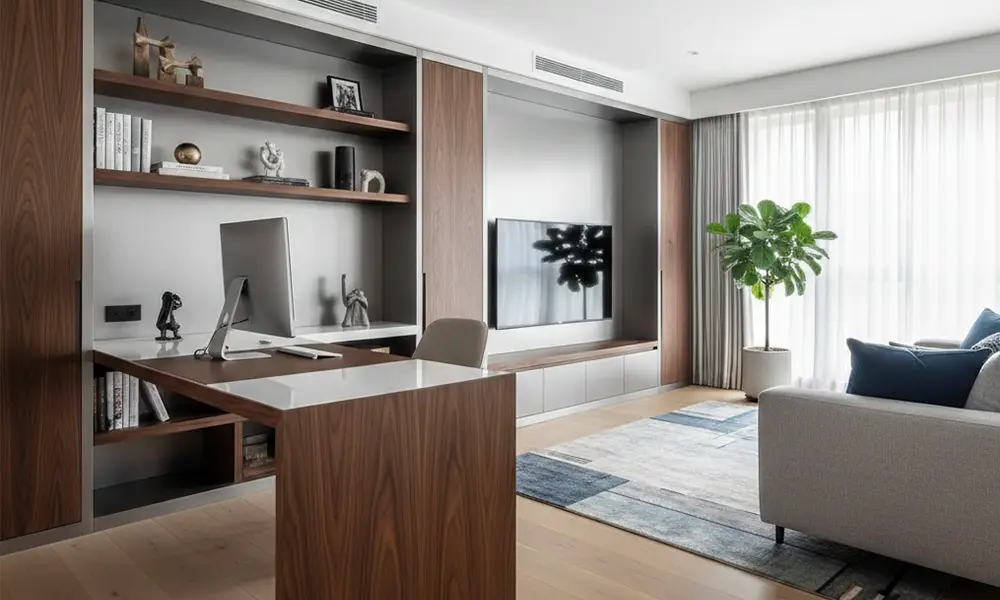 No layout integrado, o escritório planejado compartilha espaço com a sala de estar, quarto ou outro ambiente social. Aqui, o desafio vai além da funcionalidade: é preciso equilibrar uso profissional e estética residencial.