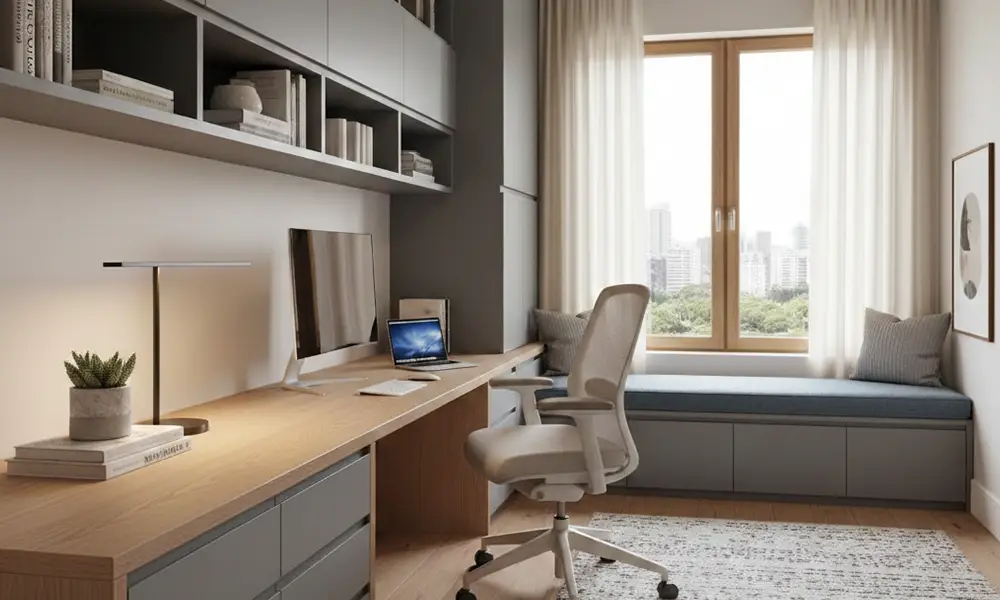 O primeiro ponto é entender que, em espaço reduzido, não há margem para mobiliário “decorativo”. Cada peça precisa ter função clara, como, por exemplo, mesas com gavetas integradas que eliminam a necessidade de um móvel extra. Bancadas que funcionam tanto para trabalho quanto para estudo evitam duplicidade de uso. Armários que servem como apoio lateral ajudam a concentrar armazenamento sem espalhar volumes pelo ambiente.