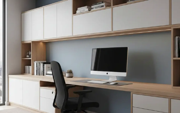 Outro ponto frequentemente negligenciado é o alcance. Objetos de uso diário, como teclado, mouse, caderno, telefone ou headset, devem estar dentro da chamada “zona de conforto”, evitando movimentos repetitivos de extensão excessiva dos braços. Prateleiras muito altas ou gavetas muito baixas podem parecer detalhe no projeto, mas impactam diretamente a experiência de uso.