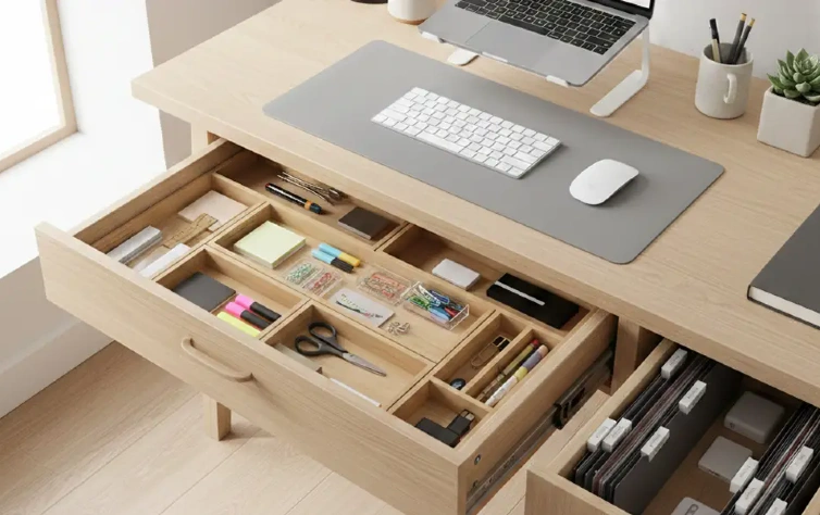 A boa notícia é que, quando o mobiliário ajuda, o esforço diminui muito. Divisórias internas nas gavetas fazem diferença porque evitam aquele acúmulo silencioso de cabos, papéis e acessórios soltos. Quando cada item tem um espaço definido, guardar deixa de ser tarefa e vira movimento automático.