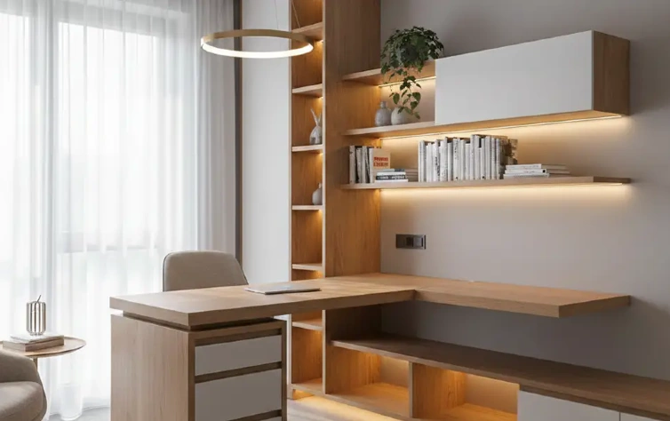 Luminárias minimalistas com foco direcionável funcionam bem quando ajustadas corretamente. Spots no teto ou perfis de LED embutidos nos móveis planejados iluminam a superfície de trabalho sem ocupar espaço útil. Já as fitas de LED integradas a nichos ou painéis ajudam a criar profundidade visual e suavizar o ambiente, especialmente em home offices integrados à sala ou ao quarto.